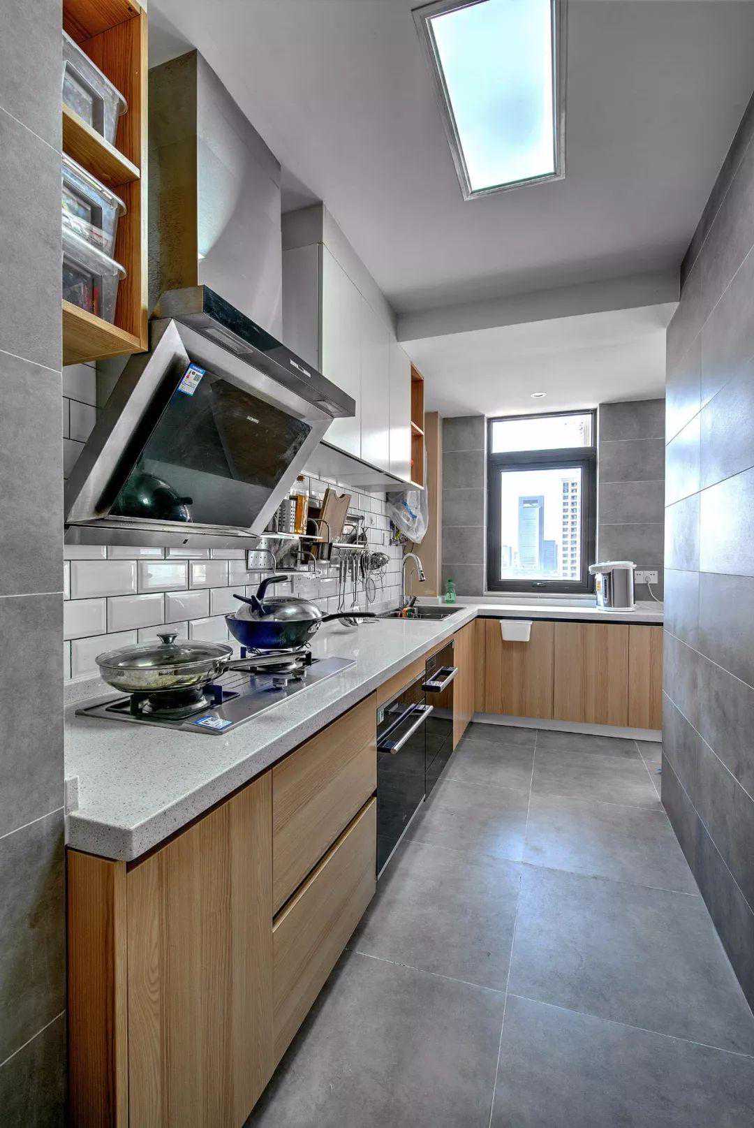 长条形的铝扣板吊顶,作为厨房天花的吊顶材质,效果也是非常的美观简洁。