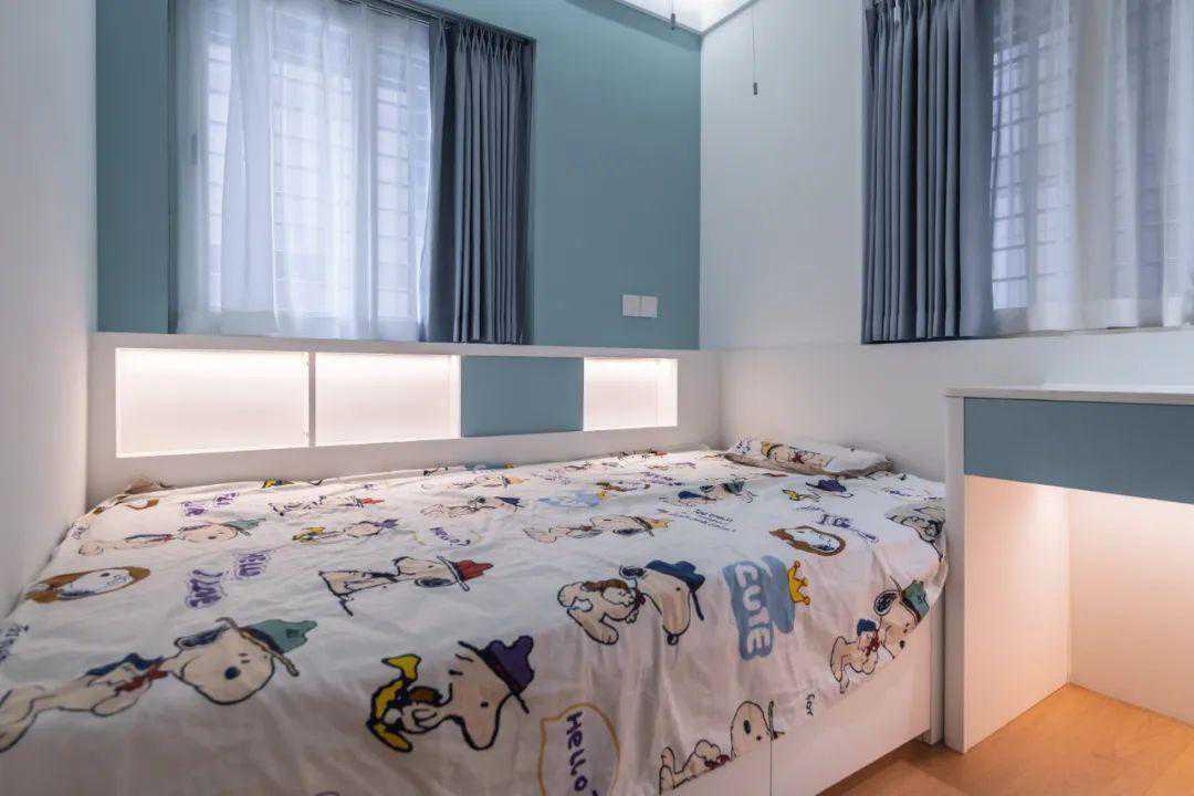 主卧墙面用的是湖蓝乳胶漆,床两边各有两个插线孔,非常方便居住者使用。也许我们都有这种经历,等到住进房子才发现,预留的插线孔不够要外接插线板,既难看又不方便,所以一定要多留几个。