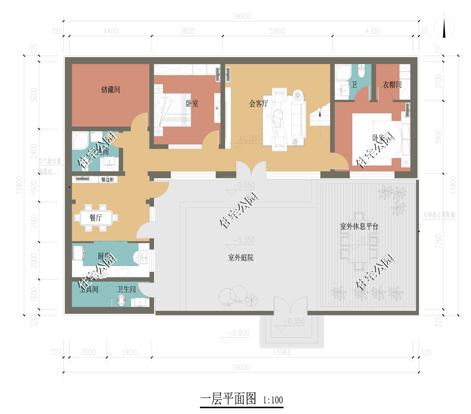 辅房便是厨餐区域,合理避免油烟对室内的侵扰;除去居室内的卫生间,庭院西南角也设计公卫一间,方便客人使用。